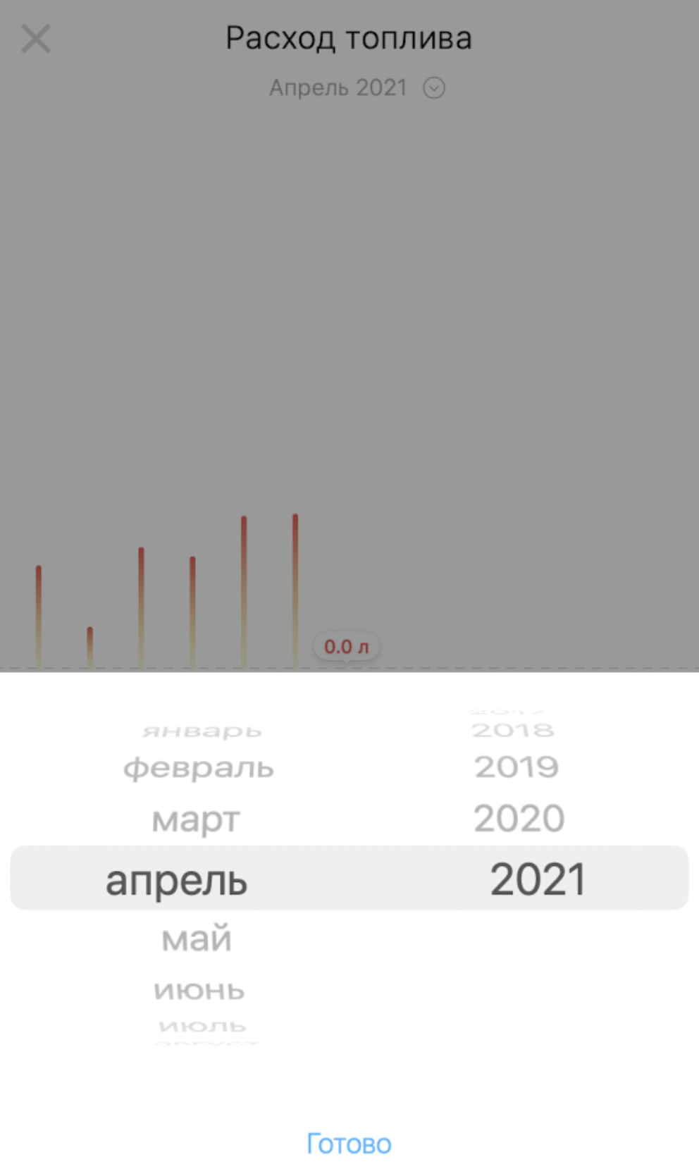При детальном просмотре в приложении вы можете выбрать месяц, для которого необходимо отобразить статистику. Для этого нажмите на название указанного месяца и в приложении отобразится список месяцев, для которого можно просмотреть статистику по расходу топлива.